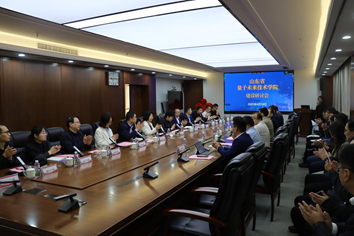 4月18日上午,山东省量子未来技术学院揭牌仪式暨建设研讨会在kaiyun体育网页登录入口办公楼第一会议室隆重举行。山东省教育厅高等教育处处长曾宪文,济南量子技术研究院执行院长张强、副院长周飞,河南大学纳米科学与材料工程学院副院长白锋,中国电信济南分公司党委书记、总经理刘晓峰,中电信量子集团华北公司副总经理洪泰辉,九章(济南)量子科技有限公司总经理徐佳敏应邀出席。学校党委书记刘春华,党委副书记、校长刘宗明,教务处、kaiyun体育网页登录入口、材料科学与工程学院、化学化工学院、信息科学与工程学院、管理科学与工程学院相关负责同志参加,相关学院师生代表在分会场参会。会议由学校党委常委、副校长王霞主持。