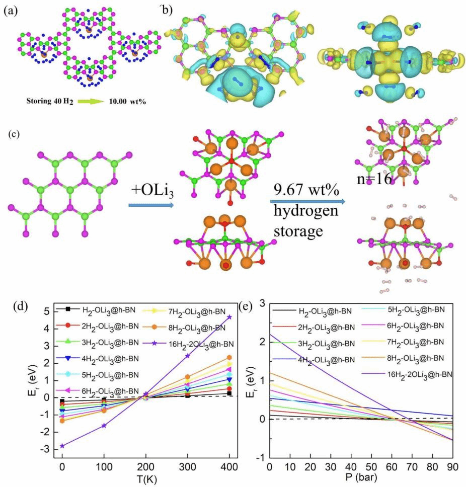 氢能是一种可持续的绿色能源,温和条件下储氢密度低是氢能发展的瓶颈之一,高容量、快速吸附、稳定易再生是储氢材料的发展目标。自石墨烯被发现之后,由于其优异的结构特征和电子性质,原子厚度的二维材料被广泛应用于储氢领域。张宁宁等人对具有纳米介孔的g-C6N7和h-BN单层的储氢性能进行了理论研究。研究发现,纳米介孔的g-C6N7和h-BN单层对氢分子的吸附能皆小于0.1 eV,并不具有良好的储氢性能,不能直接作为储氢材料。而Mg修饰的g-C6N7(Mg@g-C6N7)单层可作为高容量的储氢材料,Mg@g-C6N7单层可吸附10个H2且具有10 wt%的质量储氢容量;研究还发现,Mg2+ 与第1至第4个H2分子中的H之间存在轨道相互作用和静电相互作用,而只有强静电相互作用使第5至第10个H2分子结合到Mg2+阳离子上。同时,对超碱团簇OLi3修饰的单层六方氮化硼(OLi3@BN)的储氢性能的研究发现,O-B键足够强,使得超碱团簇OLi3锚定在单层h-BN衬底上;H原子与Li+之间的弱轨道相互作用和静电相互作用使得单层2(OLi3)@BN可吸附16个H2分子,质量储氢量高达9.67 wt%;最后,研究了温度和压力对16H2-2(OLi3)@BN稳定性的影响,发现16H2-2(OLi3)@BN体系在室温、微压下稳定。两项研究结果表明,Mg@g-C6N7和OLi3@h-BN单层皆是很有前途的储氢材料。