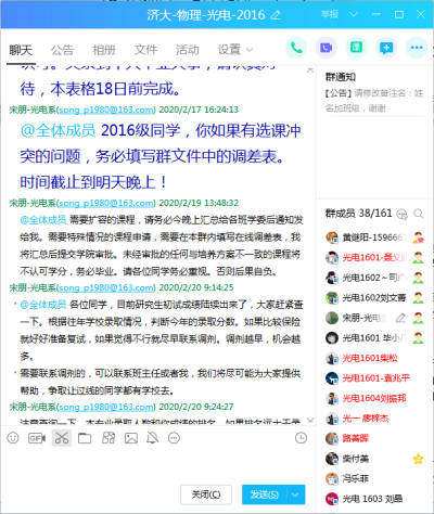 宋朋主任具有多年光电专业培养方案制定和修订经验。针对疫情期间学生选课面临的沟通不畅问题,宋朋主任全力协助学院组织光电专业学生完成网络选课,为专业所有学生提供培养方案的选课咨询和指导,根据学生个性发展,提供课程选课指导,保证学生最优化选课。对于毕业生而言,本学期选课尤为重要,选课问题可能会直接影响学生能否顺利毕业。为此,宋朋主任通过之前为每个年级入学时建立的专业年级QQ群,直接向所有专业学生发布相关选课政策、解读培养方案、随时提供一对一的选课咨询,并收集相关选课问题上报学院教办为学生们提供选课帮助。
