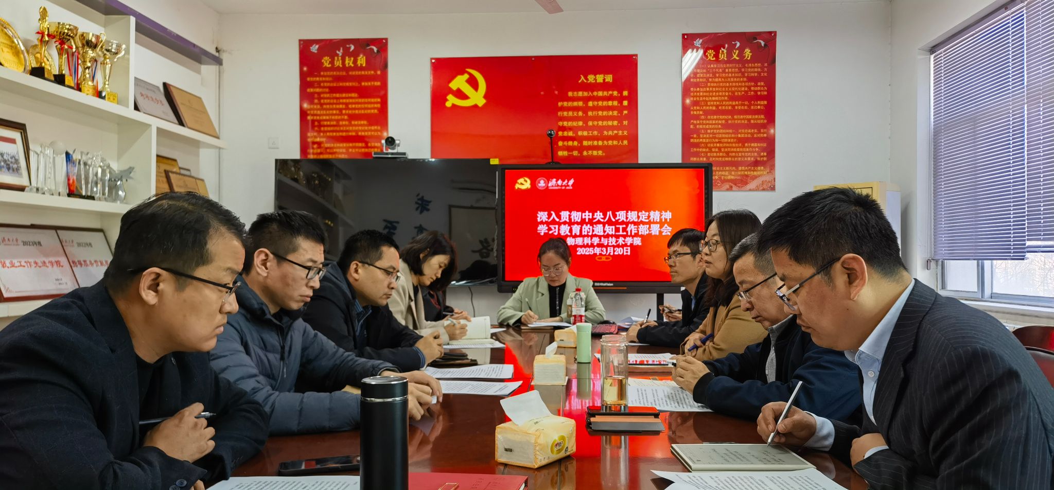 会议强调,在具体工作中,一要统一思想,深刻认识学习贯彻中央八项规定的重要意义。开展深入贯彻中央八项规定精神学习教育,是以习近平同志为核心的党中央作出的重大决策部署,是巩固深化学习贯彻习近平新时代中国特色社会主义思想主题教育和党纪学习教育成果、纵深推进全面从严治党的重要举措,是密切党群干群关系、巩固党的执政基础的必然要求。目前学校正处于“冲一流、进百强”的关键时期,全院党员干部要深刻领会开展学习教育的重大意义,切实把思想和行动统一到党中央决策部署上来,为加快推进学校高质量发展提供坚强保障;二要落实到位,确保学习教育取得重大实效。这次学习教育要求逐级逐层认真履责,学院党委会扛牢“全面从严治党”主体责任,各党委委员和班子成员要发挥好示范引领作用,各党支部书记要主动靠上、全程负责,把各环节工作任务落实到位。要准确把握党中央部署和省委要求,一体推进学查改,融入日常、抓在经常。要展开学习研讨、开展问题查摆和集中整治,要切实从师生需求出发,解决师生关切问题;三要坚持两手抓两促进,推进学习教育走深走实。刚刚结束的全国两会提出“全面实施新时代立德树人工程”“深入实施科教兴国战略”等战略部署,学校也提出“向改革要动力,向创新要活力”的顶层设计,物理学院作为基础学科所在学院,要以国家重大战略需求为牵引,以务实的态度,提升干事创业的本领,因此,在学习教育中要坚决反对形式主义,要坚持以学促干,紧密结合重点工作任务,以学习教育实效助推学校、学院高质量发展,做到在学习教育中确保干事创业走深走实。