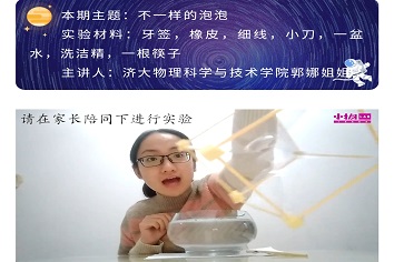 志愿者们提前录好了实验课堂的视频,写好实验课堂的讲稿,将内容发送给山东省少儿图书馆的老师,由他们将实验课堂在山东省少儿图书馆的微信公众号上播出。在视频课程中,志愿者们先用牙签和橡皮只做正方体和三棱锥模型,制作好模型后,就把泡泡液加入到模型中,最后就得到了不一样形状的泡泡。为什么会出现不同形状的泡泡呢?随后志愿者用简单易懂的语言,告诉了小朋友们得到不同形状泡泡的原理。视频的内容虽然简单,但其中的物理知识深奥并且有趣。本次活动收获了较好的社会反响,这期视频收到了很多的点赞,同时受到了小朋友们的喜爱,获得老师家长们的称赞。