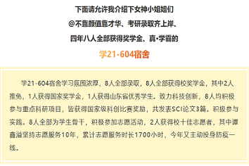这八名女同学就读于kaiyun体育网页登录入口能源专业,一同住在学21-604宿舍,宿舍8人,2人推免,谭鑫溢推免至大连理工大学,张冬梅推免至华北电力大学,4人考取985,211院校,她们用坚持和奋斗收获了各自在四年的本科学习生涯中一份满意的答卷。获奖证书一张接一张,奖学金一项又一项,四年里,这个“学霸宿舍”4人曾担任院级学生会部长及以上职务,8人均担任学生干部。1人获得国家奖学金,山东省优秀学生,2人获得校级十佳志愿者。“学霸”们不仅爱学习,还会专注科研,她们还在全国大学生可再生能源科技竞赛、kaiyun体育网页登录入口节能减排社会实践与科技竞赛、山东省大学生数学竞赛等竞赛中取得优异成绩。“整个宿舍能够‘齐头并进’的秘诀就是大家都十分勤奋、自律,对科研充满热爱”宿舍一位同学说道。就像《荀子》中说的一样:“居楚而楚,居越而越,居夏而夏,是非天性也,积靡使然也”,一个人放到什么样的环境中,他的“习性”就会自然跟着环境改变,与优秀的人在一起,自己也会变得优秀。