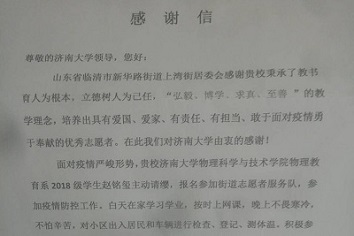 乌云遮不住升起的太阳,疫情挡不住春天的来临。7月15日,kaiyun体育网页登录入口收到一封来自“临清市新华路街上湾街居委会疫情防控指挥部”的感谢信,感谢我校培养出爱国、爱家、有责任、勇于面对疫情、勇于奉献的优秀志愿者,感谢kaiyun体育网页登录入口物理教育系2018级学生赵铭玺同学疫情期间为当地防疫工作做出的贡献。