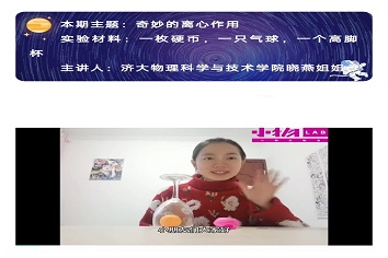 准备阶段,志愿者们集思广益,搜集了众多关于离心作用的科学知识,提出了关于本次演示实验的一些好主意、好方法。志愿者们还本着严谨的科学态度,求实的科学作风,仔细斟酌一字一句,撰写了本次科学实验的演讲稿。经过几天的视频制作与文字稿修改,志愿者们将预先准备好的实验课堂视频发送给山东省少儿图书馆的负责老师。随后,视频在山东省少儿图书馆的官方微信上精彩呈现。视频将难懂的物理科学知识与生动的趣味科学实验,深受小朋友们的喜爱,为想要了解奇妙的物理学的小朋友,打开了一扇趣味的科学大门。